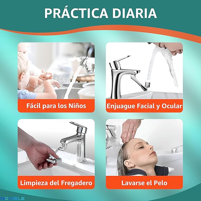 Se ajusta al 99% de los grifos: no requiere habilidades especializadas ni herramientas complejas de fontanería. Su montaje es sencillo y puede realizarse de forma manual en cuestión de segundos. Perfecto para lavabos de cocina y baño, ofreciendo una solución práctica y eficiente para cualquier hogar.